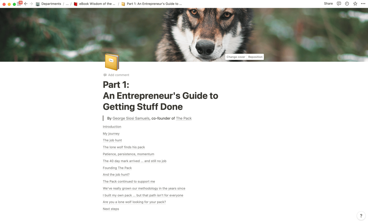 As an example, here's a screenshot of a Notion eBook for "lone wolf" entrepreneurs (e.g. solopreneurs) and professionals. It contains a lot of insights around getting things done from over a decade of experience across business and tech.