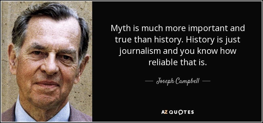 “Mythology is not a lie, mythology is poetry, it is metaphorical. It has been well said that mythology is the penultimate truth–penultimate because the ultimate cannot be put into words. It is beyond words. Beyond images, beyond that bounding rim of the Buddhist Wheel of Becoming. Mythology pitches the mind beyond that rim, to what can be known but not told.”