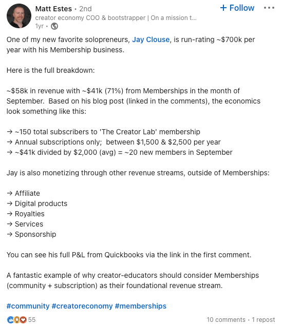 Jay Clouse is a multifaceted entrepreneur, known for his diverse roles as a writer, podcaster, and course creator. Before embarking on his journey in the creator economy, he was involved in startups and successfully sold two companies. Now, he is dedicated to helping others achieve creative independence, leveraging his extensive experience and unique insights into the rapidly evolving world of content creation. As a well-known solopreneur, his recent moves pushes him into the realm of “micropreneur” (small team, high revenues).
